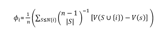 Basically, the Shapley value of a player i will be the division between an aggregation of two elements of all possible groups S (this are all the groups in the different rounds that did not include player i ), and the number of players in the game. This division to the number of players allows making the calculation an “average” representation of all the game.